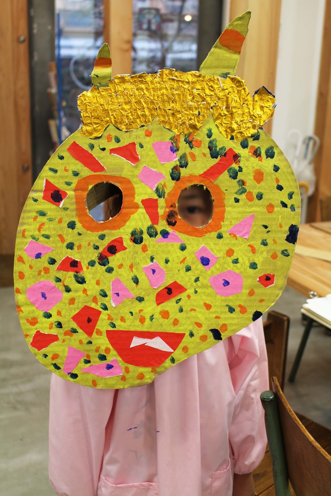 引き続き、こどもC 小学生・幼児混合クラスの制作です。小学生は、「お面制作・最終日」です。こちらは、黄色い鬼さん。お顔が賑やかな色で彩られて、ユニークですね。上手に出来ました!